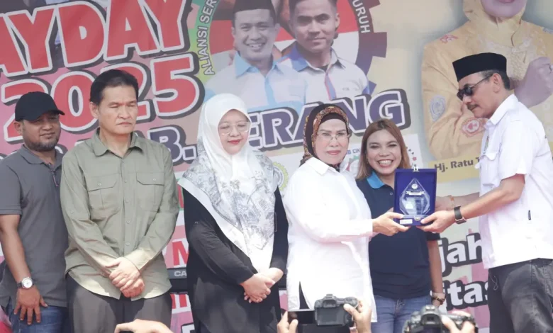 SERANG,- Bupati Serang, Ratu Tatu Chasanah menghadiri peringatan Hari Buruh Internasional atau May Day, di Lapangan Kampung Bahbul, Desa Situ Terate, Kecamatan Cikande, Kabupaten Serang, Banten, Kamis, 01 Mei 2025.