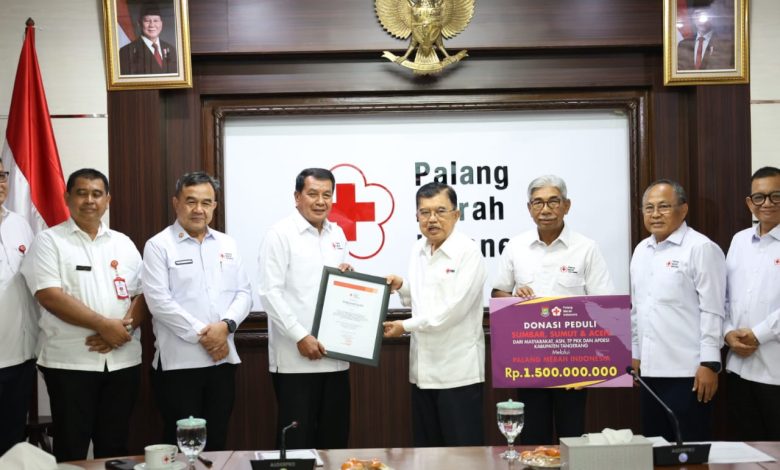 Jakarta,- Bupati Tangerang Moch. Maesyal Rasyid bersama jajaran PMI Kabupaten Tangerang menyerahkan donasi kemanusiaan sebesar Rp1,5 miliar untuk membantu korban banjir bandang dan longsor di wilayah Sumatera. Penyerahan donasi bantuan yang berasal dari keluarga besar ASN Kabupaten Tangerang, TP-PKK, serta APDESI dilaksanakan di Kantor Pusat PMI Jakarta dan diterima langsung oleh Ketua Umum PMI Pusat, H. Muhammad Jusuf Kalla, Rabu (10/12/25).