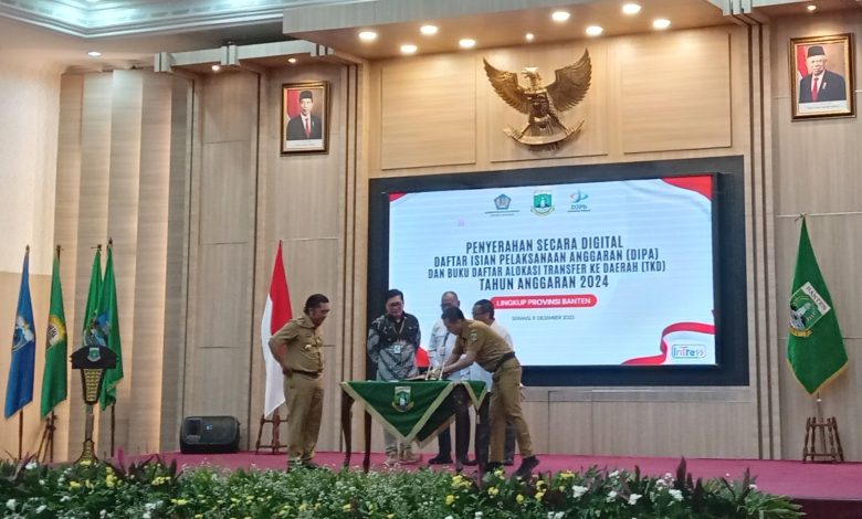 KOTA SERANG,- PJ Gubernur Al Muktabar menyerahkan Daftar Isian Pelaksanaan Anggaran (DIPA) dan Buku Alokasi Transfer Ke Daerah (TKD) secara digital di Pendopo Gubernur Banten Pemerintahan Provinsi Serang, Senin(11/12).