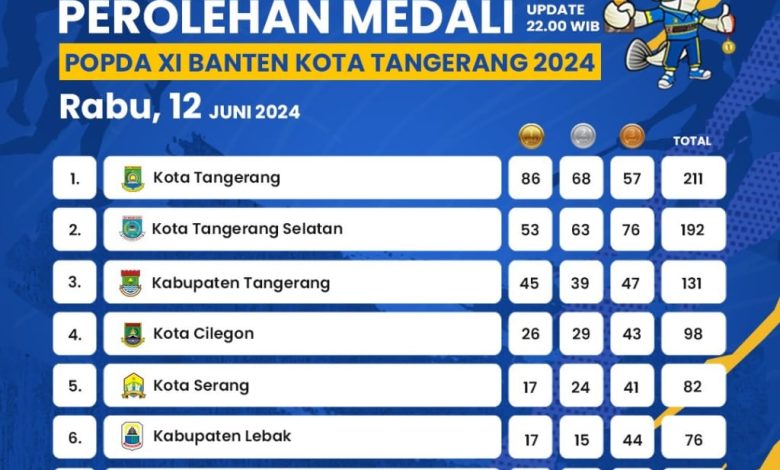 Secara rinci, 211 medali yang diraih Kota Tangerang ialah 86 medali emas, 68 medali perak dan 57 medali perunggu. Posisi dua dan tiga terpantau silih berganti antara Kota Tangerang Selatan dan Kabupaten Tangerang.