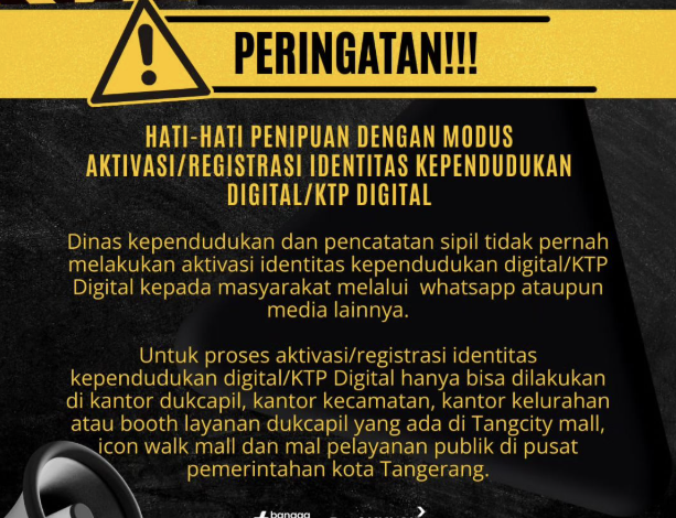 Kepala Bidang Pelayanan Pendaftaran Penduduk Disdukcapil Kota Tangerang Sri Warsini mengungkapkan, Disdukcapil Kota Tangerang tidak pernah melakukan aktivasi Identitas Kependudukan Digital atau KTP Digital kepada masyarakat melalui WhatsApp atau pun media lainnya.