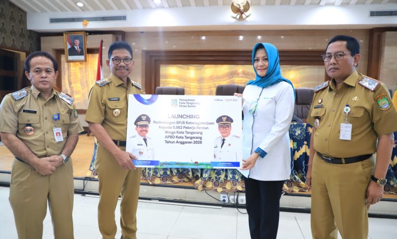 KOTA TANGERANG,- Pemerintah Kota Tangerang melalui Dinas Sosial (Dinsos) secara resmi me-launching program Jaminan Kematian (JKM) dan Jaminan Kecelakaan Kerja (JKK), bagi pekerja rentan warga Kota Tangerang, Tahun Anggaran 2025 kepada sebanyak 5.952 penerima manfaat. Penyerahan secara simbolis diberikan langsung Wali Kota Tangerang Sachrudin, di Ruang Akhlakul Karimah, Puspem Kota Tangerang, Senin (24/3/25).