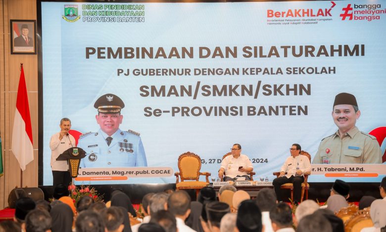 KOTA SERANG,- Penjabat (Pj) Gubernur Banten A Damenta melakukan silaturahmi bersama ratusan Kepala Sekolah (Kepsek) SMAN/SMKN dan SKhN di Pendopo Gubernur Banten, KP3B Curug, Kota Serang, Jumat (27/12/2024). Para Kepala Sekolah harus mempunyai berbagai inovasi dalam pengajaran di sekolah agar tidak monoton.